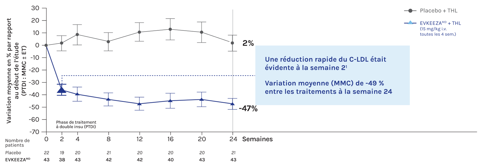 Une étude de phase 3 multicentrique, à double insu, à répartition aléatoire, en groupes parallèles et contrôlée par placebo menée chez des patients âgés de 12 ans et plus atteints de HFHo. Les patients suivaient des traitements de fond hypolipidémiants, notamment par des statines à la dose maximale tolérée, de l’ézétimibe, des anticorps inhibiteurs de la PCSK9 et l’aphérèse des lipoprotéines. Au cours de la période de traitement à double insu, 43 patients ont été répartis au hasard pour recevoir EVKEEZA à raison de 15 mg/kg par voie i.v. toutes les 4 semaines et 22 patients ont reçu le placebo. Pendant la période de traitement au su, 64 patients ont reçu EVKEEZA à 15 mg/kg i.v. toutes les 4 semaines1.