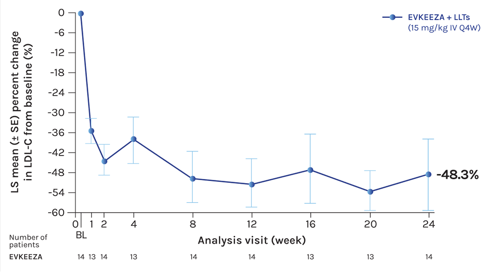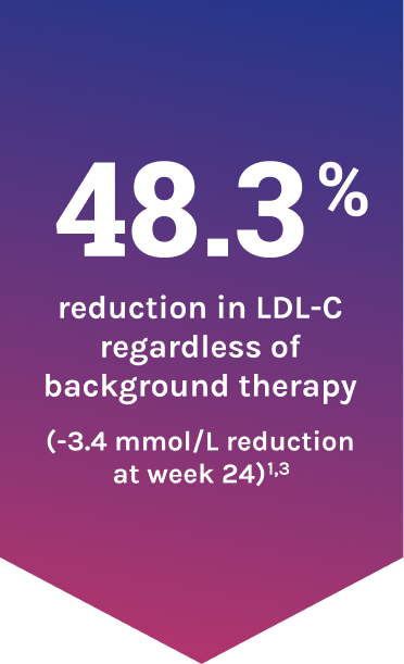 EVKEEZA reduced LDL-C levels by ~50% when added to current standard therapies1,2 (-3.4 mmol/L absolute change; LS mean treatment difference; 95% CI: -4.5 to -2.3; n=65; P<0.0001)